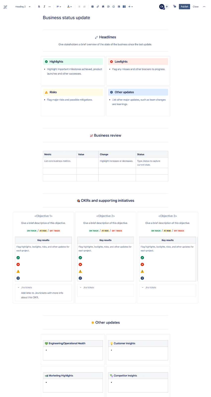 Great knowledge isn’t long; it’s findable. Use Confluence page templates and naming rules to keep quality high and search clean. You can also create starter templates to entice standardization. Some examples of standardized templates include…